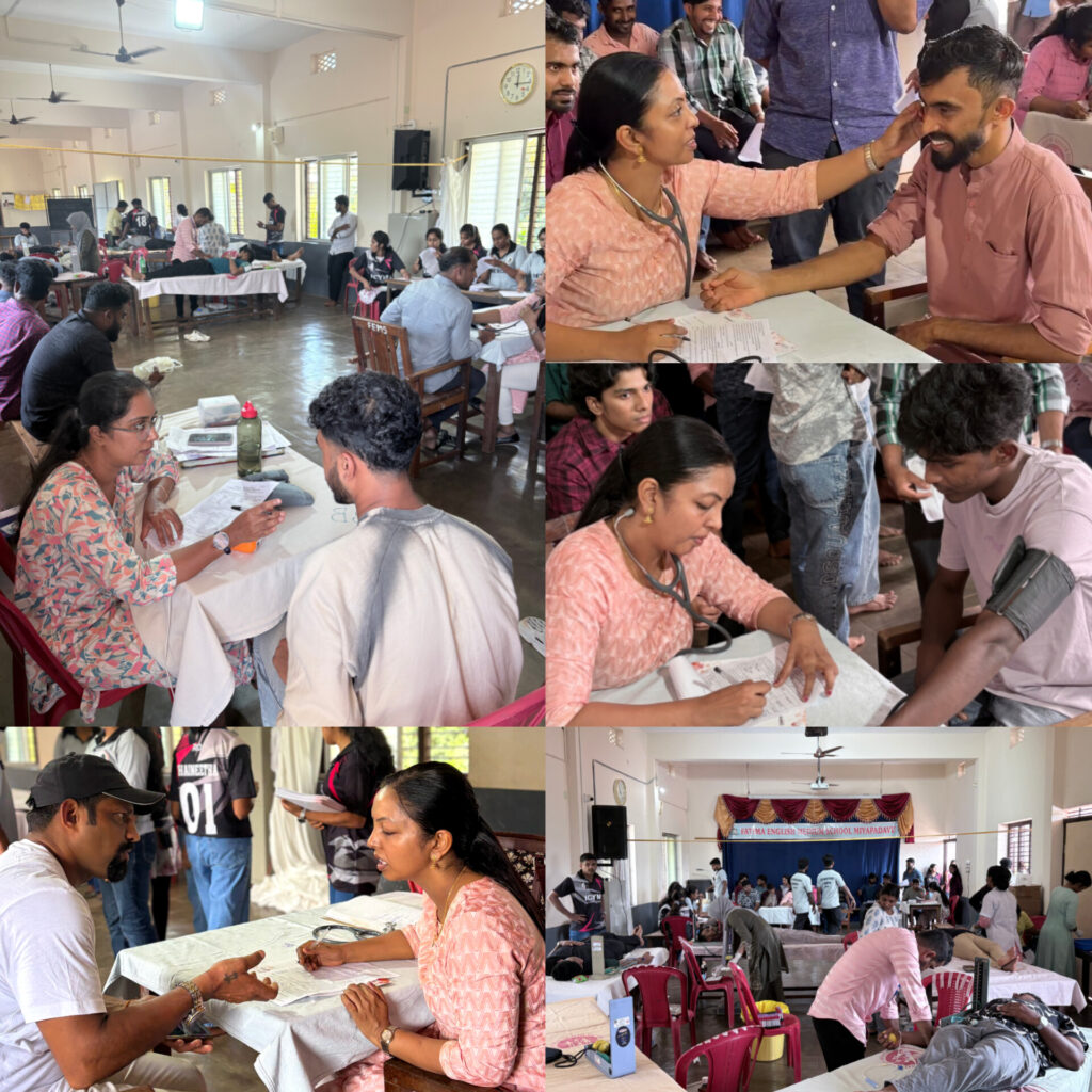 Miyapadav : The Indian Catholic Youth Movement (ICYM) Kasaragod Vicariate, in collaboration with the ICYM Miyapadav Unit, The Government General Hospital, Kasaragod and Red Drop Mangalore, successfully organized a Blood Donation Camp on Sunday, 5th October, from 9:30 AM to 12:00 PM at Fatima English Medium School, Miyapadav.