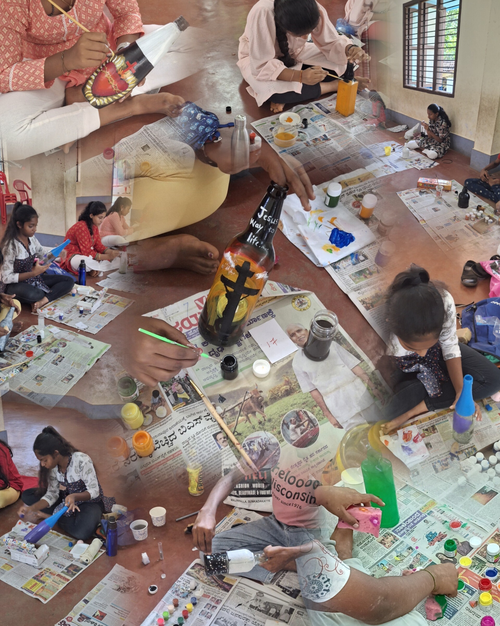 Bottle Art (6th to 9th Std) – Participants showcased stunning art by upcycling glass and plastic bottles.